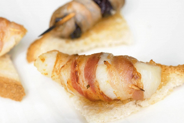 Красивейшая закуска, для которой потребуются гребешок, чернослив, копченая свиная грудинка, вустерширский соус, сливочное масло и пшеничные тосты.