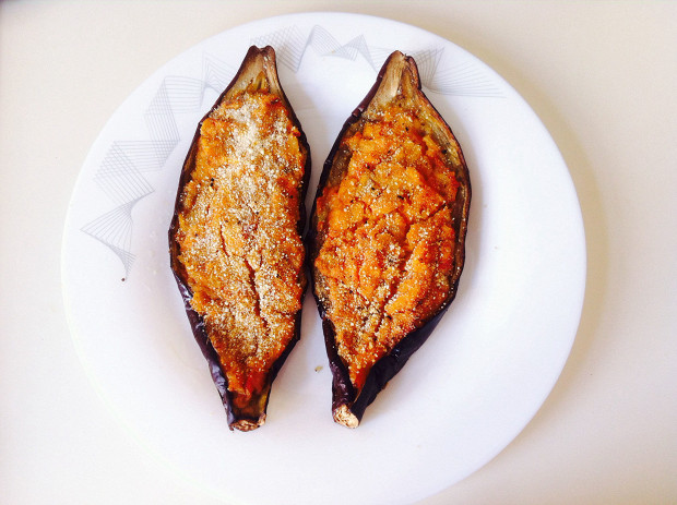 Простейший рецепт, в которой баклажаны начиняются рисом и запекаются в духовке до состояния, когда баклажанная плоть и крупа пропитываются помидорной заправкой с большим количеством сливочного масла и острыми специями. Для хруста также неплохо посыпать баклажанные лодочки панировочными сухарями. Рецепт безмясной, но такой эффектный, что и мясоеды к нему точно потянутся. Особенно, если полить горячие баклажаны холодным йогуртом или мацони.