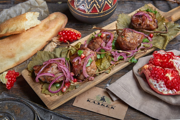 Говядина сначала минимум час маринуется вместе с зирой и кориандром, а после запекается с курдюком и луком.