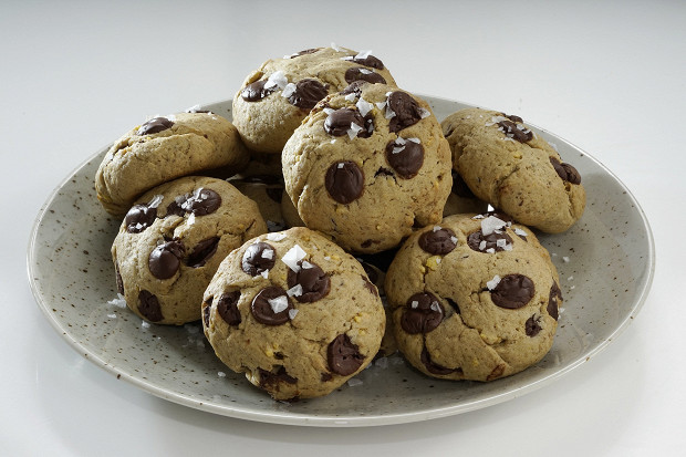 Буйство текстур и вкусов. Сначала мы замесили тесто из двух видов сахара, маргарина, льняного яйца (в рецепте есть объяснение) и кукурузного крахмала. А затем в это тесто интегрировали хрустящие кукурузные хлопья и капли горького шоколада. Если и этого покажется мало, то готовое печенье можно покрыть хлопьями соли.