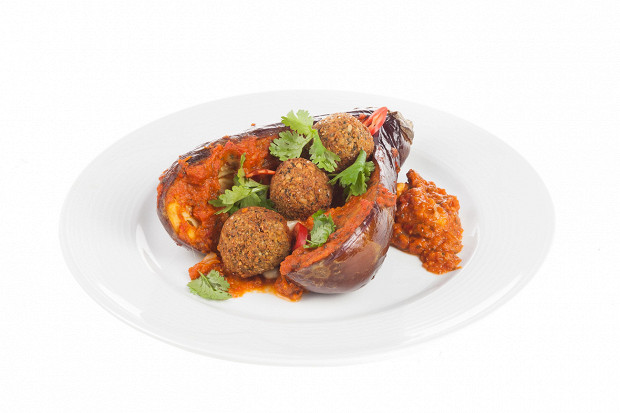 Фалафель часто добавляют в вегетарианскую питу или шаурму, наш вариант — с запеченным баклажаном. Получается очень сытно — такого обеда хватит даже спортсмену.