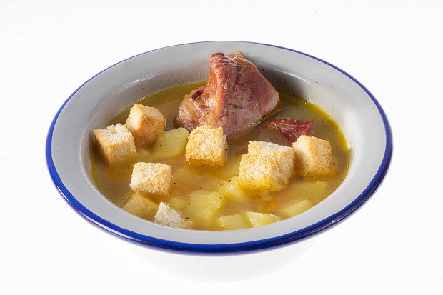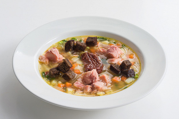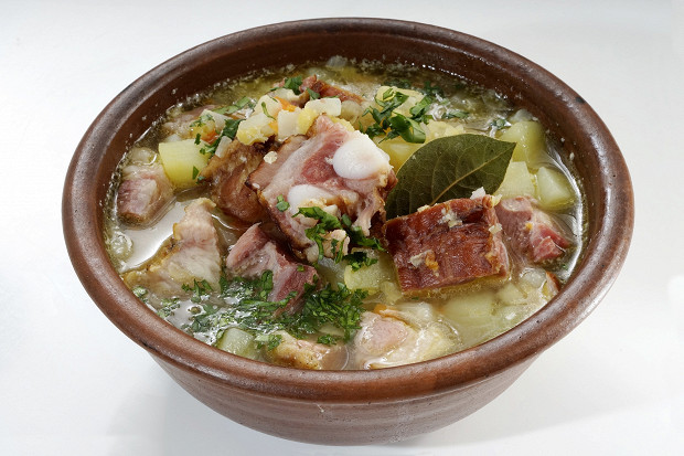 Довольно несложный суп, в котором в постный бульон почти в самом конце добавляются копченые свиные ребра. При желании это могут быть и не ребра вовсе, а любые другие копчености.