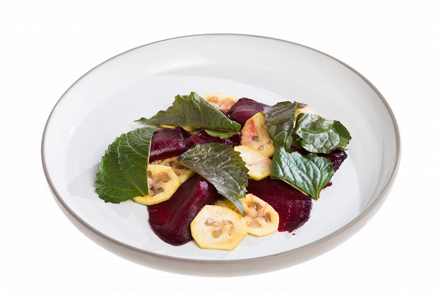 Печеная в соли свекла и свежие плоды фейхоа выступают на равных — их нужно уложить на тарелку, дно которой укрыто густым ореховым соусом.