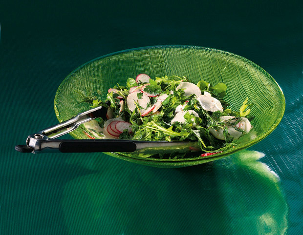 Легчайший салат, основу которого составляют травы и поровну взятые и редис с дайконом. Если жгучести покажется мало, смело добавляйте туда еще черную или зеленую редьку. А то и обе.