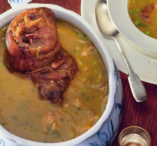Сухой горох — натура упорная и требует длительной варки. А чтобы горох окончательно сдался и его потянуло на нежную кремовость, лучше всего подождать, пока он остынет и настоится в бульоне. Вывод: гороховый суп варят большими кастрюлями, на следующий день и даже неделю спустя он становится только вкуснее. Чтобы варево не надоедало, его можно каждый день разнообразить добавками: сегодня — бланшированным зеленым горошком, как в этом рецепте, завтра — мятой, кинзой или ложечкой песто. Данный рецепт не просто суп, а съедобный конструктор: свиную рульку, когда она выполнит главную роль и обогатит бульон ароматом копчености, можно достать из супа и подавать саму по себе — с тушеной капустой, картофелем, горчицей и хреном (рецепт смотрите здесь), сделав вдобавок еще и основой семейного ужина.