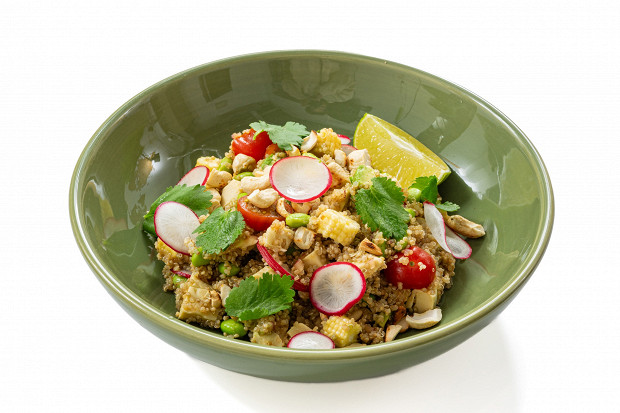 Сложносочиненный салат, который мы наполнили разными составляющими, да и разными текстурами, — так куда интереснее есть. Веганская курица — это сейтан, который тут отлично сложился с заправкой из оливкового масла, соевого соуса и лайма.