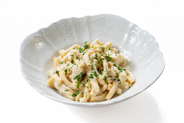 Изначально паста Альфредо, придуманная в честь ее автора, повара Альфредо Ди Лелио, готовилась из собственно пасты, сливочного масла и сыра. Со временем рецепт стал чуть меняться — например, в пасту альфредо также стали добавлять курицу или креветки, оставляя нетронутым сливочно-сырный соус. В пост нельзя ни сливки, ни сыр, и этой сливочной текстуры мы добились благодаря использованию сырных дрожжей. Сейтан тут вмешивается в соус и пропитывается его ароматами и маслянистостью.
