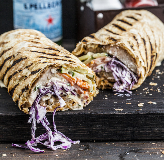 Куриное филе в пестрой смеси специй и соусов со взятыми поровну краснокочанной и белокочанной капустой. Готовую шаурму нужно запекать на мангале до тех пор, пока на лаваше не отпечатается рисунок решетки. Рецепт Андрея Заварницина, шеф-повара ресторанов Meatless.