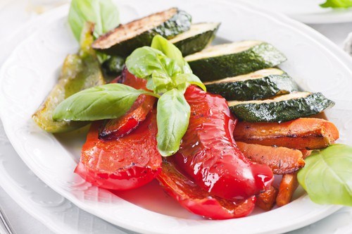 Пропитайте оливковым маслом молодые цукини, тыкву сквош и желтый сладкий перец, а после запеките на огне до появления румяного оттенка. Подавайте со свежим базиликом.