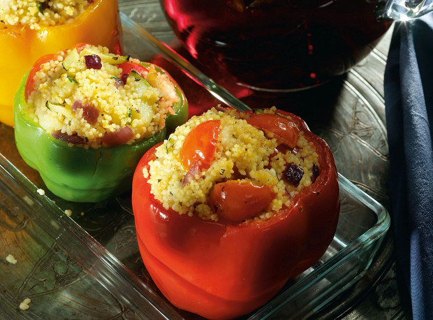 Кускус в начинке выигрышнее риса: он дополнительно к интересной текстуре дает еще и ореховый привкус. К тому же убыстряет приготовление: кускус не нужно варить, достаточно залить куриным бульоном и дать минут пять пропариться. А вот перец предварительно лучше бланшировать — тогда стенки станут эластичнее и охотнее примут начинку. Свитой перцу в рецепте служат цукини, лук, помидоры черри, петрушка и сыр фета. Последний можно при желании заменить на что-нибудь более выразительное, например на любой козий сыр или пармезан.