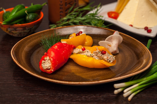 Рулетики из баклажана с ореховой начинкой, которые открывают меню любого грузинского ресторана, тут приготовлены при участии перца. В ресторане «Оджахури» перец сначала обугливают на гриле, а потом начиняют всем чем положено: молотыми грецкими орехами с кинзой, сельдереем, острым красным перцем, гранатными зернами и прочим грузинским многоголосьем. На наш взгляд, перец у баклажана в качестве съедобной обертки выигрывает: в нем маслянистость и отголоски мясного вкуса как в синеньких, зато с плотной начинкой он контрастирует более ярко, да и цветовая палитра у готовой закуски намного приятнее.