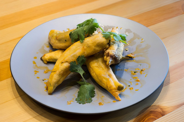 Минутка экзотики в нашем обзоре. Крохотные фаршированные перчики в кляре, прихваченные кипящим маслом, жгучие и прекрасные. Часть популярного в Южной Корее стритфуда твигима, когда в кляр могут попасть соцветия капусты, мелкие кальмары, крабы и прочая мелкоштучка. Их потом едят руками, обмакивая в соус. В Москве когда-то хороший твигим готовили в ресторане K-grill (оттуда и рецепт), а сейчас, кажется, нигде. При внешней простоте рецепт требует довольно серьезного корпуса разных азиатских приправ вроде бульона даши, шелкового тофу и кисло-сладкого соуса. Собрать его можно в любой корейской лавке или в интернете, а потом удивить гостей, подав плошку с хрустящим твигимом к саке или просто хорошему рислингу.