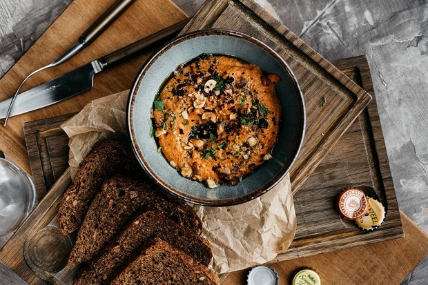 Вариация на тему айвара — знаменитой болгарской закуски из перцев. Полтора десятка ингредиентов, среди которых есть карри и сумах (вероятно стоит поискать заранее). Полчаса терпения, пока запекается перец, несколько минут работы блендером и паштет готов. Рецепт из ресторана Craft Kitchen.