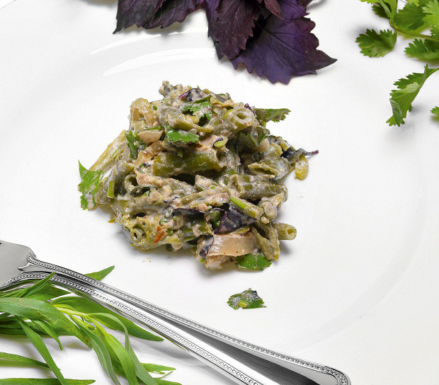Редкий образец, в котором используют стручковую фасоль. У нее совсем иная текстура, нежели у красной, но все же очевидно, что эти растения — близкие родственники.