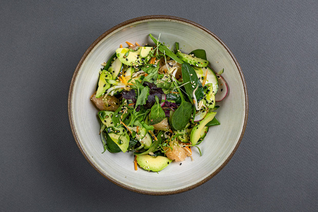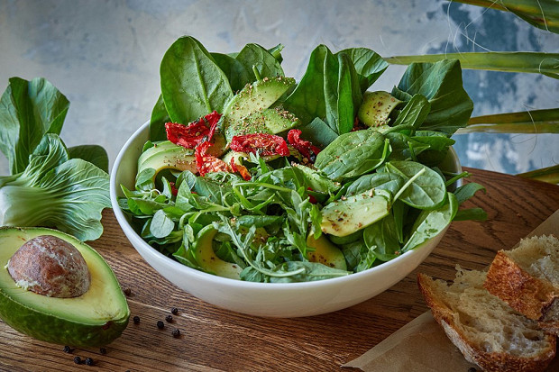 Рецепт великого ресторатора и шеф-повара Глена Баллиса. Пять видов зелени, авокадо, вяленые помидоры и соус с азиатскими мотивами.