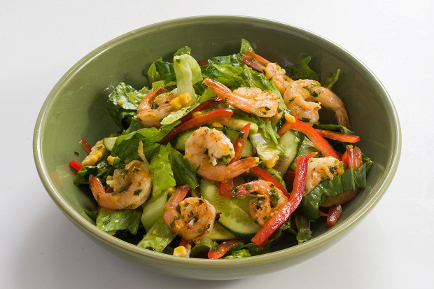Классный и простой салат с креветками, которые сначала маринуются в апельсиновом соке, а затем отправляются на гриль.