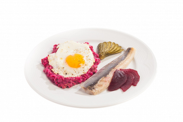 Горячая закуска с сельдью и говяжьей тушенкой. В классическом рецепте используют солонину, которая до сих пор производится в большом количестве в Германии.