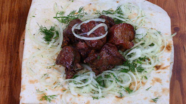 5. Перед жаркой шашлык нужно заблаговременно, хотя бы за час, достать из холодильника, тщательно очистить все налипшие куски маринада — кольца лука, чесночные ошметки, травы и проч., иначе они сгорят на огне и оставят на мясе черные неаппетитные подпалины.