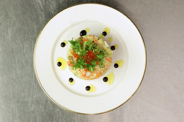 Давно проверено, что салату оливье очень идут морепродукты и ароматы копчения. Тут есть и копченая семга, и камчатский краб, и даже красная икра.