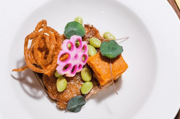Котлета сама по себе полна душистых трав, а в тарелке она еще встречается с нежнейшим шпинатом.