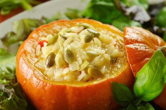 Традиционное армянское блюдо — тыква, фаршированная рисом, фруктами или сухофруктами. В этом рецепте вместо чернослива используют алычу, которая, соединившись с яблоком и корицей, превращает рис в нежнейшую сладкую субстанцию.