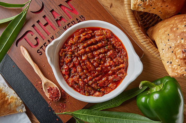 Езме — традиционная турецкая овощная закуска, в составе которой есть и болгарский перец. Его понадобится вдвое меньше, чем помидоров, но вкус перца все равно тут очень заметен. Рецепт из ресторана Cihan Turkish Steak and Kebab.