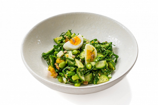 Очень простой салат, в котором важную роль играет соус: сложившись из яблочного уксуса, нерафинированного подсолнечного масла и дижонской горчицы, он стал мощным скрепляющим звеном между яйцом, бобами и черемшой.