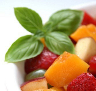 Клубнично-персиковый салат с дыней, шампанским и ягодным соусом