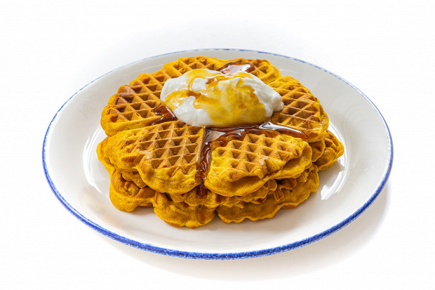 В начале этой подборки мы уже говорили о том, что тыкве очень идет карамель кленового сиропа. И вот еще одно тому подтверждение. Сироп тут не участвует в готовке тыквы, а лишь присоединяется к уже готовым вафлям. Сладость его сдерживает нейтральный греческий йогурт, поданный рядом.