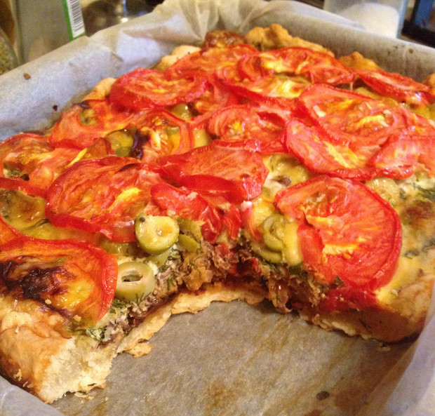 Пирог с тунцом, луком и помидорами