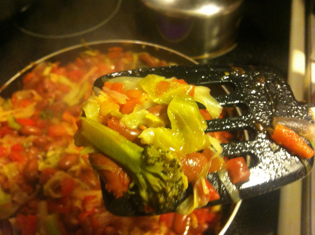 Еще один вариант гарнира (особенно хорош он будет с говядиной и свининой), который вполне может при случае солировать. Фасоль отвечает за сытность, капуста — за легкость и текстуру. Прелесть этого рецепта в том, что его можно собрать из того, что под рукой. Консервированная фасоль и томаты в собственном соку в холодильнике могут храниться месяцами, просто добавьте сезонные овощи — и гарнир готов.