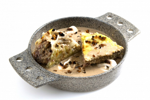 Интересный перевертыш — из десерта в горячее блюдо. Собранное по принципу мильфея пирожное: фарш из индейки, прослоенный тонкими листьями молодой капусты. Это игра в знамый с детства вкус голубцов, в ресторанную подачу наконец, это просто что-то новое, что само по себе уже повод попробовать приготовить.
