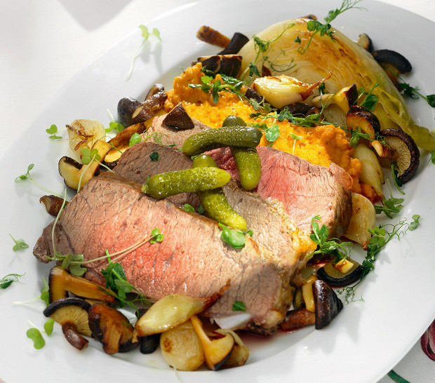 Длинное название и довольно простой, но образцово-показательный рецепт. В нем собраны лайфхаки, которые впоследствии можно применть к другим блюдам. И капусту и говядину перед запеканием или томлением стоит обжарить до румяной корочки, что поможет сконцентрировать вкус внутри продукта. За ароматику блюда отвечает букет из коньяка, тимьяна, лаврового листа и бульона — именно в такой смеси отец-основатель «Еды» Алексей Зимин рекомендует томить мясо. Морковь легко превращается в пюре, но если добавить к ней немного горчицы, то баланс вкуса получится идеальным.
