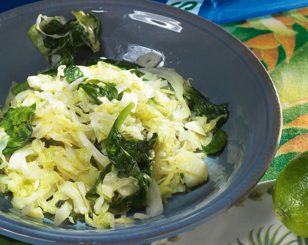 Гарнир входит в состав блазильского блюда фейжоада (вот его полная версия). Бразильцы используют жесткие листья кормовой капусты, но вместо нее можно использовать, в сущности, любую огородную зелень — от свекольной ботвы до романо, от шпината до белокочанной капусты. А можно совмещать капусту и шпинат, к примеру.