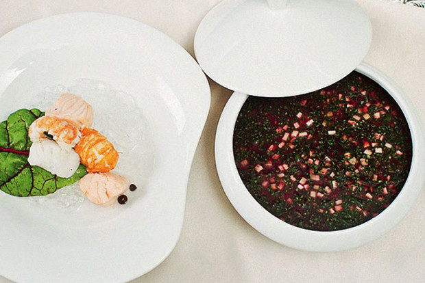 Два десятка ингредиентов, но оно того стоит. За овощную составляющую здесь отвечают морковь, огурцы, щавель, зеленый лук и свекла, разумеется. Так готовят свекольник в ресторане «Турандот».