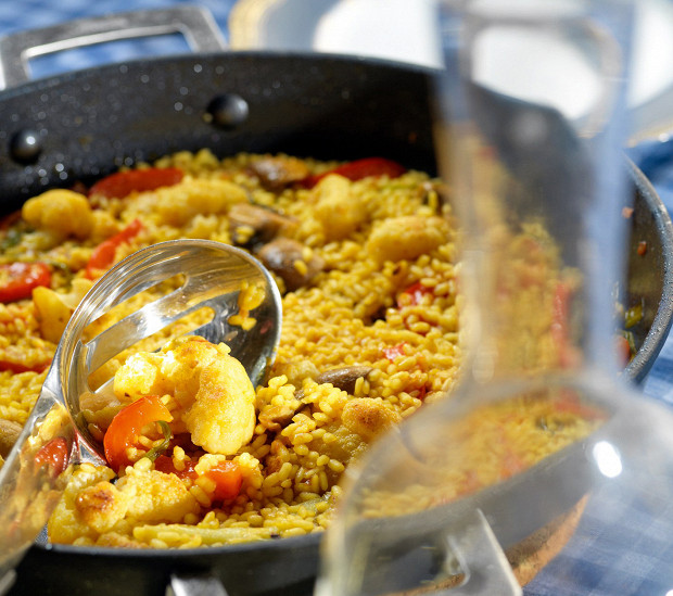 Овощи для этой паэльи следует нарезать действительно крупными кусками — во время готовки они существенно потеряют в объеме. Рис с овощами — отличный и сытный союз, который можно подавать на обед или ужин.