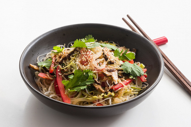 Свежий и еще не набивший оскомину салат с фунчозой и овощами. Грейпфрут придает освежающую кислинку и бодрящую горечь, а сложносочиненный соус соединяет все ингредиенты в одну стройную песню.