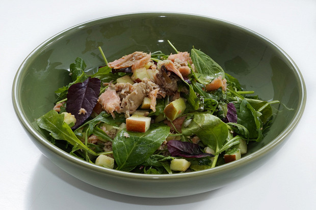 В советские времена банки с печенью трески давались только в праздничных заказах и тщательно сберегались до Нового года, чтобы пустить их на популярный тогда салат с рисом и крутыми яйцами (рецепт классического советского салата с печенью трески ищите здесь). Сегодня этот салат вышел из моды: само сочетание яйца, жирной печеночной субстанции и майонеза — удар по печени, по вашей, а не тресковой. Поэтому сюжет салата стоит увести в другую сторону: вместо риса — ворох салатных листьев, вместо яиц — кубики сладкого яблока, плюс горбуша для усиления рыбного вкуса и капелька винного уксуса, убирающего жирный привкус печенки. Все это складывается в яркий, солнечный и легкий образ и солоноватый, морской привкус на губах. Попробуйте — и сразу это почувствуете. Ведь правда, что в холодные дни даже воспоминания о море особенно приятны.
