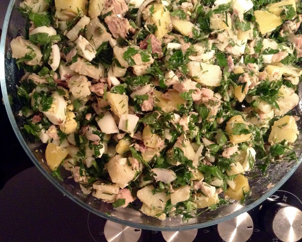 Еще один тунцовый салат, но куда более сытный, чем предыдущий вариант, так как тут в дело идут еще и картошка, и яйца. Картошку для этого салата мы варили в молоке, но если вам это кажется расточительством — варите в воде, правда, тогда картошка не будет такой нежной.