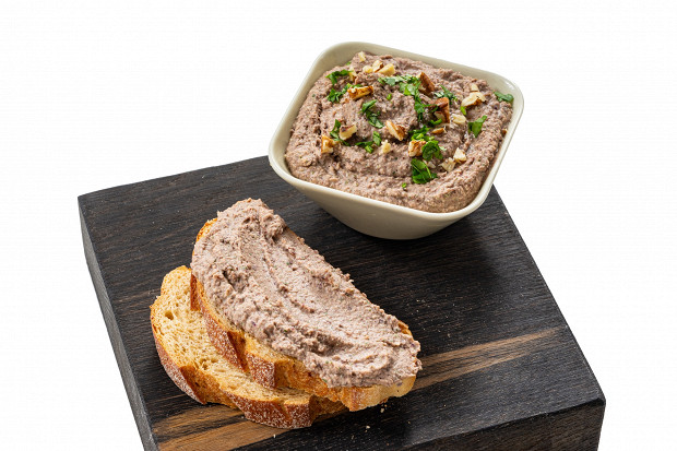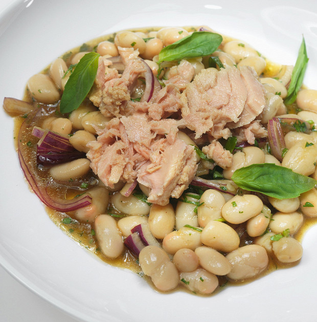 Фасоль очень хорошо ладит с тунцом — это мы уже продемонстрировали в самом первом рецепте этой подборки. Тут их союз становится еще крепче, так как обоим предстоит превратиться в хорошо взбитый паштет. Необходимой вязкости блюду добавят грецкие орехи, также пробитые в труху.