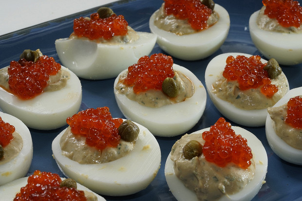 Игристое, домашнее вино, водка и пиво — всем им показана дружба с этими яйцами, фаршированными тунцом, смешанным с майонезом и петрушкой, и увенчанными икрой и каперсами.