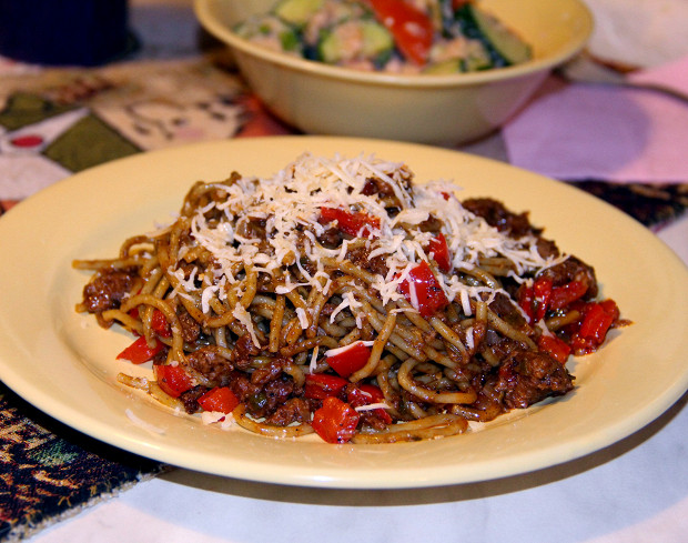 Яркий набор сопутствующих ингредиентов: болгарский перец, томатная паста, лук с чесноком, шпинат и твердый сыр. Овощи с травами потушить с томатной пастой, а потом добавить к ним тушенку. Подавать отдельно — пасту, а сверху соус.