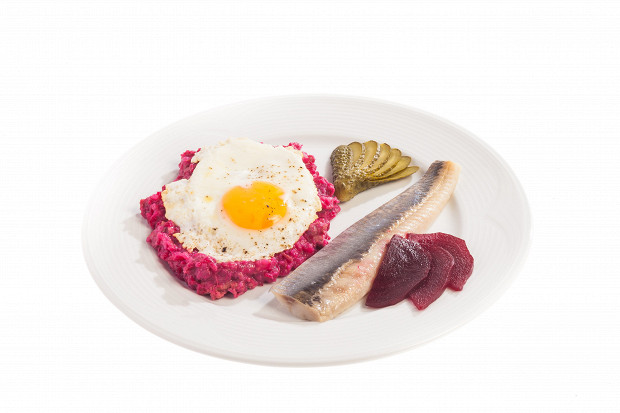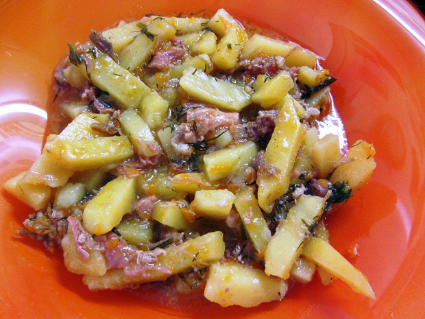 Основные ингредиенты тут — картофель, тушенка и соленые огурцы. После того как они сложатся вместе, сверху на них нужно уложить нарезанную ломтиками свеклу, яйца и зелень. Но если вам привычней, когда все ингредиенты салата перемешаны, — делайте по-своему, хуже не будет.