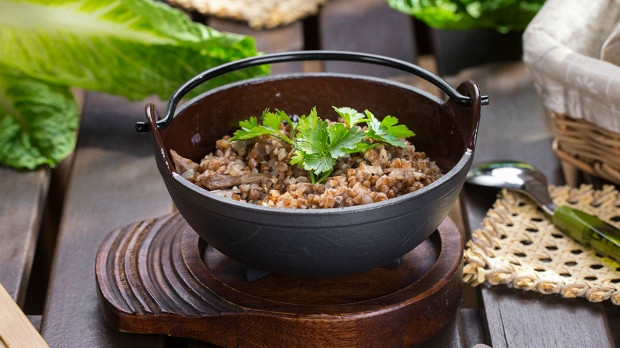 Простейший рецепт, в котором ловко соединяются два самодостаточных блюда — гречка с тушенкой и гречка с грибами. Сначала нужно сварить гречку, затем пожарить грибы, а после отправить к ним крупу и тушенку.
