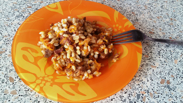Отличный союз — перловка всегда безотказно сочетается с жирным мясом. Тут важно не пропустить один нюанс: лук с морковью нужно жарить не на растительном масле, а на жире из банки с тушенкой.
