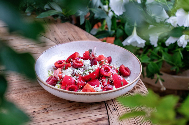 Ярчайший салат от Александра Семенова, шеф-повара ресторана Maer, можно смело назвать «Битва за урожай». Черешня, помидоры и красный лук накиданы щедрой рукой. Еще в салате задействован национальный чеченский творог калд — именно его солоноватый вкус организует хаос на тарелке. В сумме — невероятно чувственная еда, расцвеченная всеми красками южного лета. При желании калд легко заменить крупчатым домашним сыром или хорошо отжатым подсоленным обычным творогом, черешню лучше добавлять узбекскую, а лук — ялтинский, он самый сладкий.