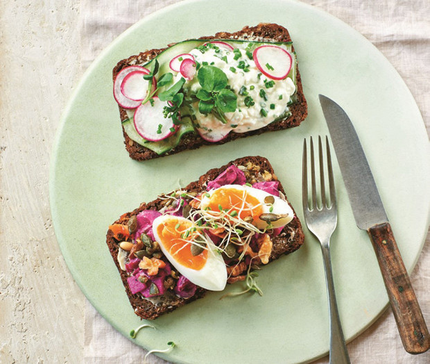 Рецепт взят из книги «Скандинавское лето». «В Дании бутерброды по этому рецепту обычно готовят с rygeost — молодым сыром, подкопченным на сене и сушеной крапиве. Мой дед был мастером в его приготовлении, и я помню, как помогала бабушке с коптильней, когда была маленькой. За пределами Дании этот сыр не найти, поэтому я заменяю его творогом. Очень простой, свежий и вкусный бутерброд».