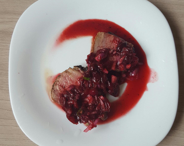 Свиные медальоны с перцем и сальсой из свежей вишни