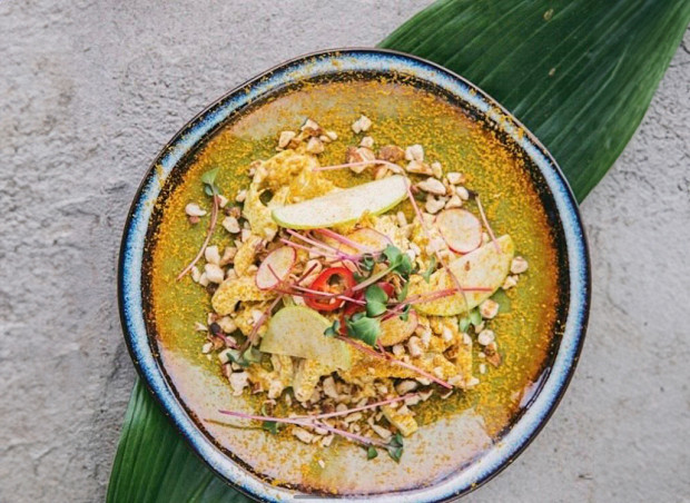 Салат приготовлен по мотивам известного в Великобритании блюда — коронационного цыпленка. Он представляет собой мясо птицы, замаринованное в пряном соусе с индийскими специями (карри, кардамон), и чатни из манго. Вариант из нижегородского бистро Ceylon содержит те же вкусы и ингредиенты: манго, имбирь, а также красный лук и изюм. Заправка — айоли, вустерширский соус и, конечно же, карри. Это очень зимнее блюдо, пряное, согревающее, после такого можно смело идти встречать Новый год на мороз.