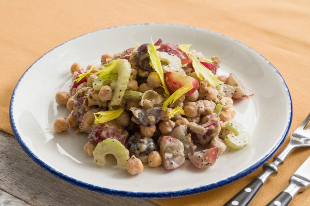 Тут виноград не просто отвечает за вкус, но и оттеняет тяжесть нута, полного белка и сытости. Сладкий кондитерский характер салату придает еще и мак, который надо обязательно добавить в соус.